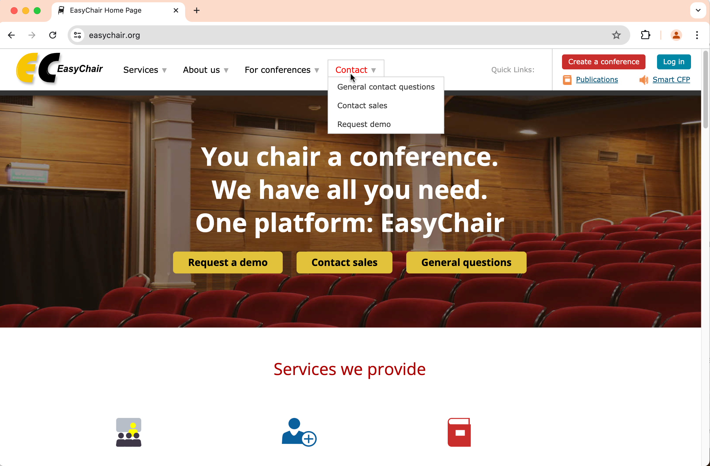 To send a general contact question, go to “easychair.org” and locate Contact tab on top bar menu.